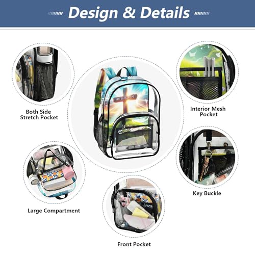 Easter Cross He is Risen Travel Clear Backpack Floral Kids Backpack for Girls Large Transparent School