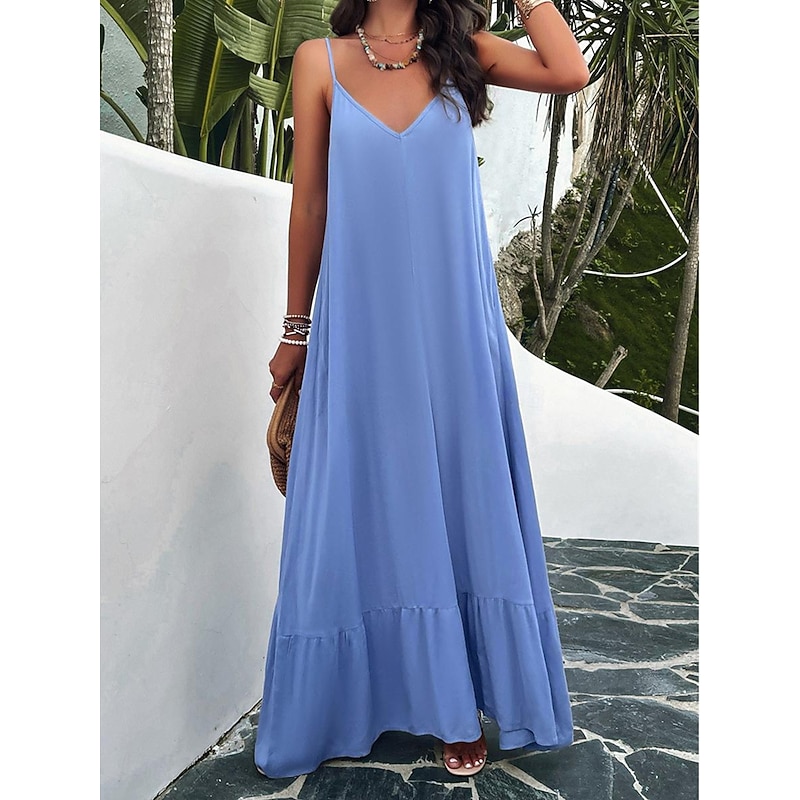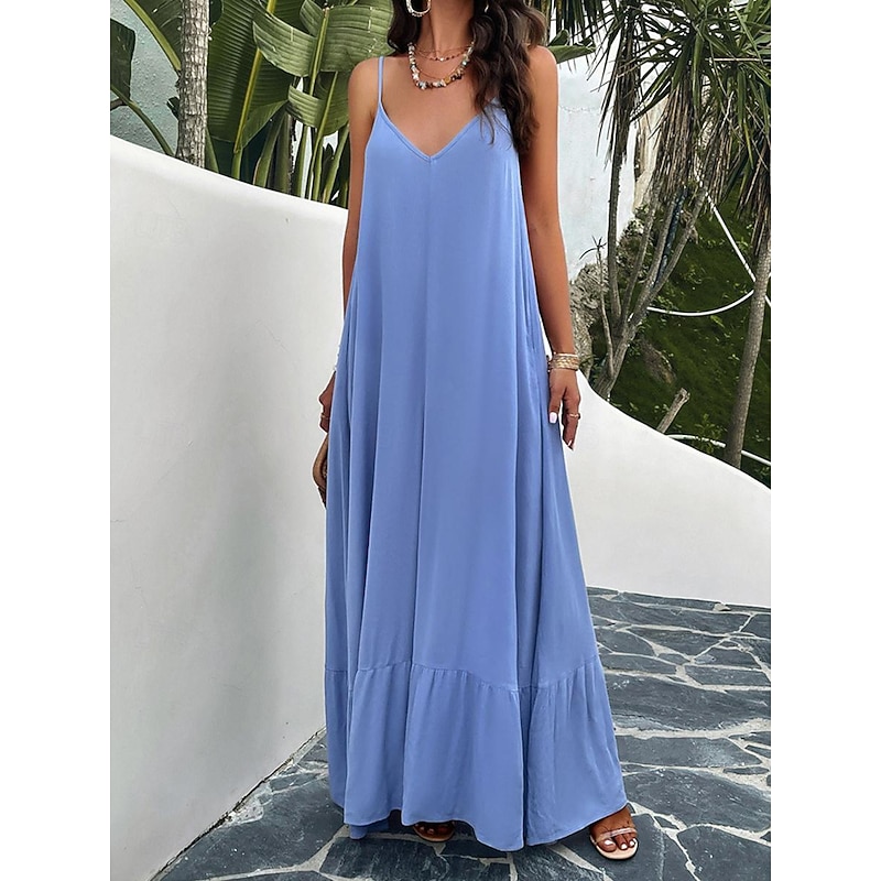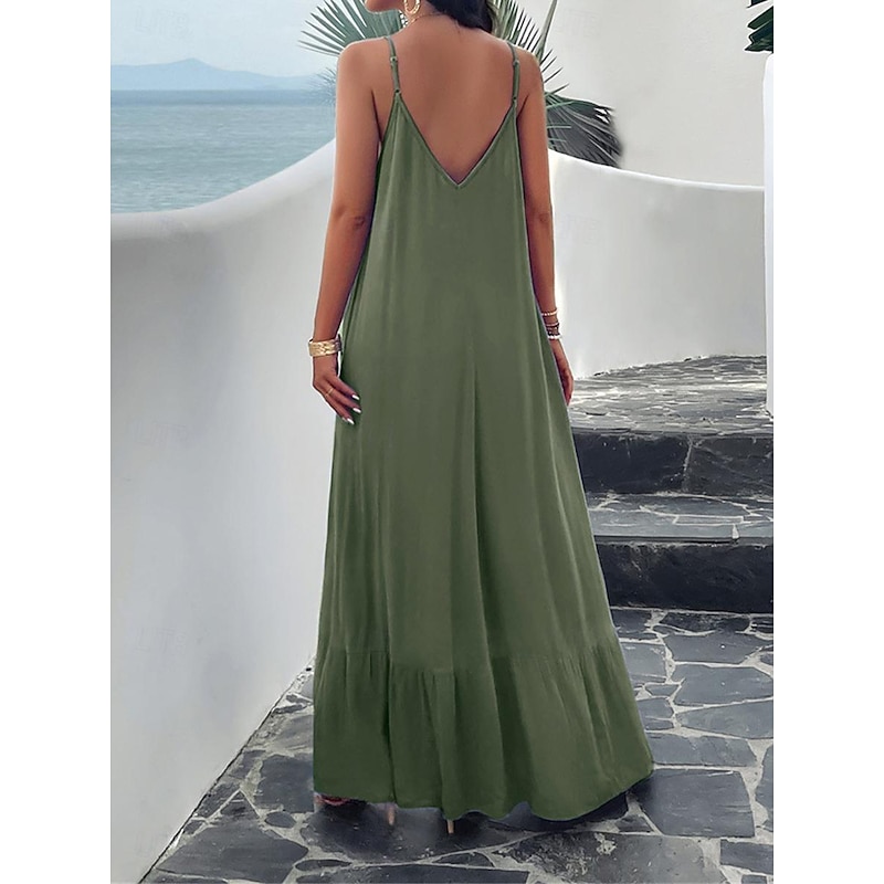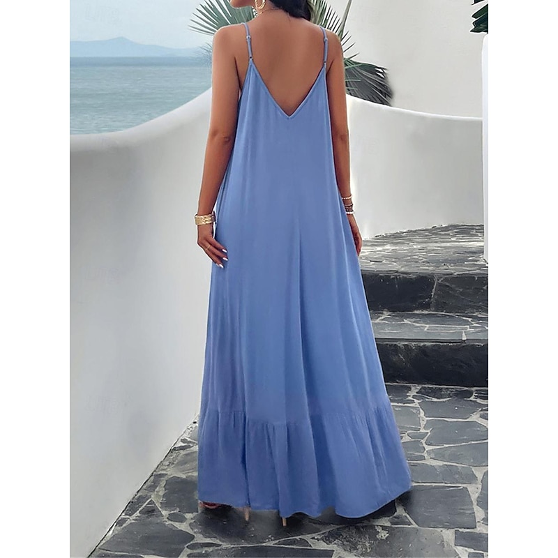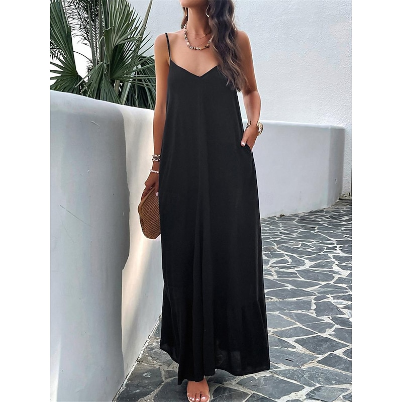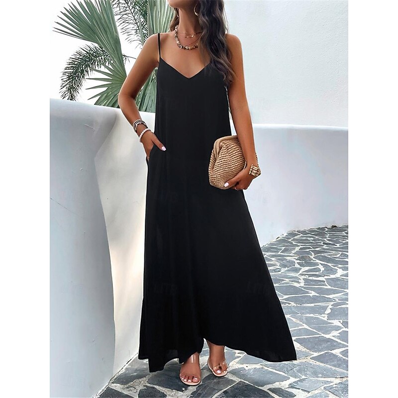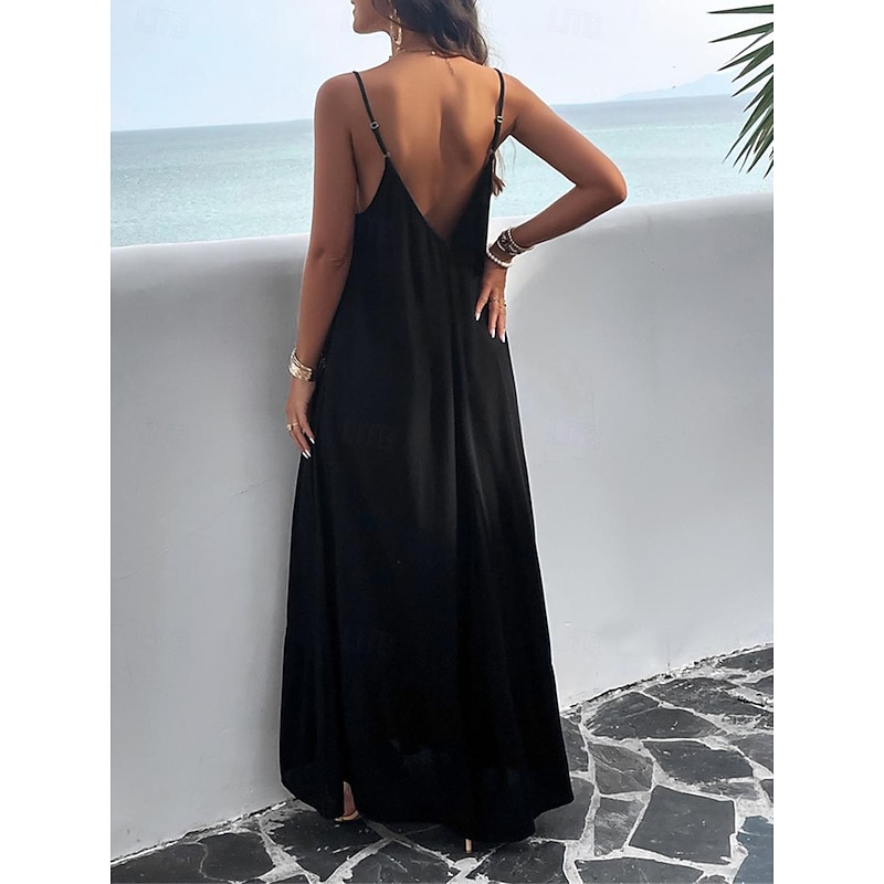 Highlights [Fabric] : Crafted from high-quality polyester, this maxi dress offers a lightweight and breathable experience perfect for summer wear. The micro-elastic nature of the fabric provides a comfortable fit, making it a go-to choice for warm weather. [Silhouette] : Designed with a loose fit, this casual dress showcases a flowing silhouette that drapes gracefully to the ankles. The relaxed style ensures comfort without compromising on elegance, making it ideal for casual outings or summer gatherings. [Design Highlights] : Featuring adjustable spaghetti straps and a flattering strap neckline, the dress beautifully enhances the décolletage and shoulders. The backless design and subtle tiered hem add a sophisticated touch, while practical pockets offer a functional yet chic element. [Occasions] : This versatile dress is perfect for a variety of occasions such as dates or casual street outings. Whether you're enjoying a summer festival or a relaxed afternoon in the city, this maxi dress adds effortless chic to any moment. [Size Range] : Available in sizes S, M, L, and XL, this dress caters to a range of body types, ensuring a comfortable and flattering fit for everyone.