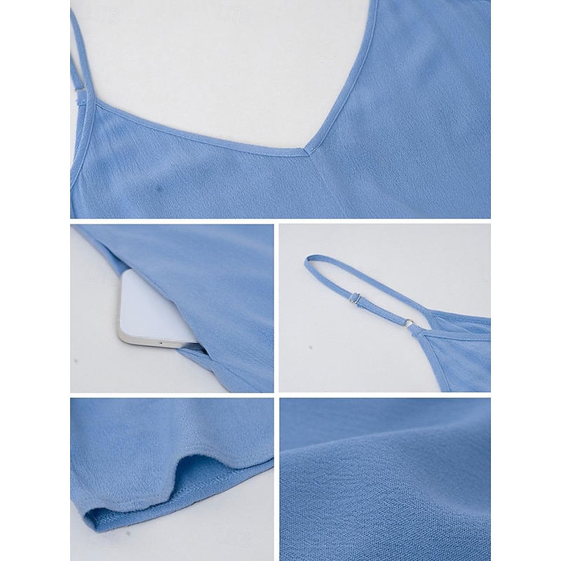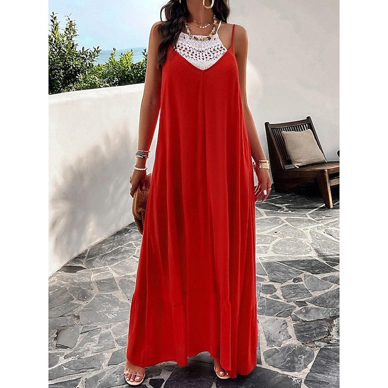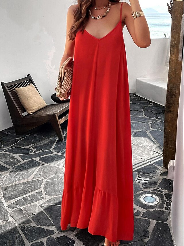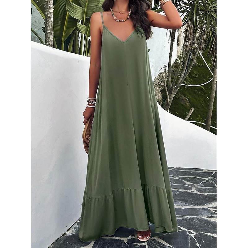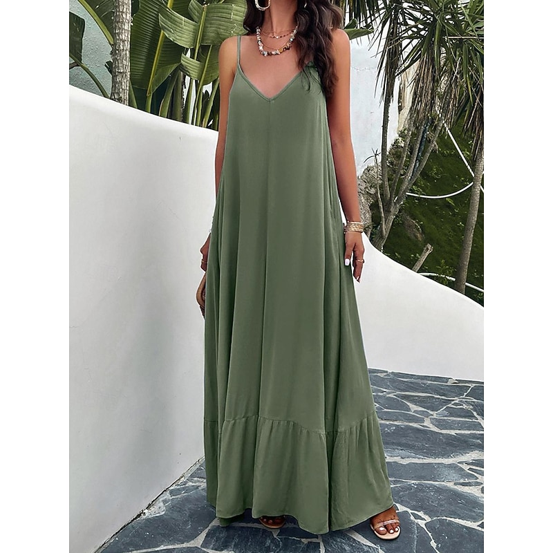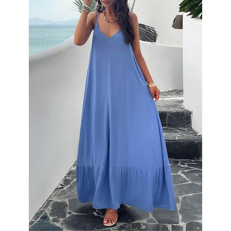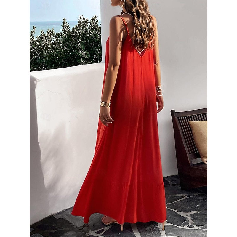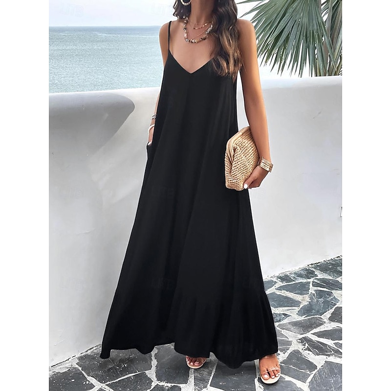 Highlights [Fabric] : Crafted from high-quality polyester, this maxi dress offers a lightweight and breathable experience perfect for summer wear. The micro-elastic nature of the fabric provides a comfortable fit, making it a go-to choice for warm weather. [Silhouette] : Designed with a loose fit, this casual dress showcases a flowing silhouette that drapes gracefully to the ankles. The relaxed style ensures comfort without compromising on elegance, making it ideal for casual outings or summer gatherings. [Design Highlights] : Featuring adjustable spaghetti straps and a flattering strap neckline, the dress beautifully enhances the décolletage and shoulders. The backless design and subtle tiered hem add a sophisticated touch, while practical pockets offer a functional yet chic element. [Occasions] : This versatile dress is perfect for a variety of occasions such as dates or casual street outings. Whether you're enjoying a summer festival or a relaxed afternoon in the city, this maxi dress adds effortless chic to any moment. [Size Range] : Available in sizes S, M, L, and XL, this dress caters to a range of body types, ensuring a comfortable and flattering fit for everyone.