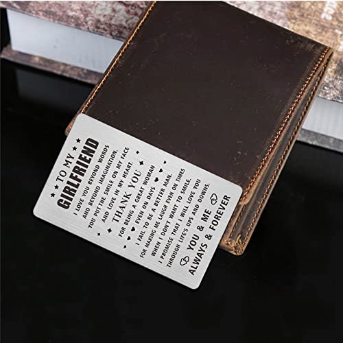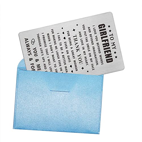 Girlfriend Gifts - Send this love card to your girlfriend to show she stays on your mind all day, night and every moment...one-of-a-kind girlfriend valentine's day gift ideas, Romantic message for your sweetheart on her birthday, christmas, anniversary, new year, thanksgiving, graduation or any other occasionOutstanding Quality - This meaningful I love my girlfriend gift is made of supreme stainless steel, Permanent engraving, won't change color or tarnish, will not easy bendLove Notes Engraved Card - To my girlfriend, I love you beyond words and beyond imagination. You put the smile on my face and love in my heart. Thank you for being a great woman even on days I fail to be a better man. For making me laugh even on times when I don't want to smile. I promise that I will love you through life's ups and downs. You & Me Always & foreverSize of Wallet Card - Approximately credit card size 3.35x2.13x0.02inch, fits perfectly in walletWell Packaged - Come and protected with beatiful free envelope, ready for gift giving, sentimental birthday gifts for girlfriend Perfect for everyday use. High quality materials and excellent craftsmanship ensure long-lasting durability.