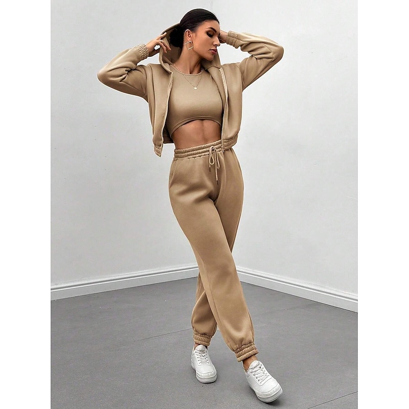 Highlights [Fabric] : Crafted from 100% polyester, this three-piece set offers a soft and cozy feel. The use of fleece material in both the jogger pants and jacket ensures warmth and comfort, while the cotton and spandex blend in the top provides elasticity and a snug fit. [Fit] : The set includes a ribbed knit sleeveless crop top that delivers a trendy, form-fitting appearance. The jogger pants feature an elastic waistband with a drawstring for an easily adjustable, pleasant fit. The oversized hooded jacket offers a relaxed silhouette, perfect for layering. [Design Highlights] : The outfit combines casual and chic elements with its mix of a sleeveless crop top, jogger pants with cuffed hems, and a hooded jacket with zip closure. The versatile neutral beige color ensures it can be effortlessly paired with various accessories. [Occasions] : Perfect for streetwear, casual daily outings, or lounging, this stylish set offers a blend of comfort and versatility. Its design makes it ideal for athleisure activities or relaxed gatherings. [Size] : Available in a range of sizes from S to XXL, catering to a variety of body shapes and preferences, this outfit ensures a flattering fit for adults.