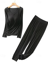 Elevate your sleepwear collection with these ultra-snug Modal pajamas for women. The trendy T Shirt top features a flattering ruched design and a V neck neckline, perfect for daily wear, lounging at home, or bedtime. Experience luxury and style with these must-have pajamas.