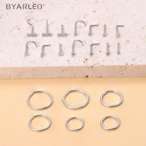• 【20ps of Surgical Steel Nose Set】The set includes 20pcs nose rings with different shapes like featuring L-shaped studs, hoops, straights, and spirals, suitable for all genders and ages. These nose rings is crafted from 316L surgical stainless steel. Professional polishing and plating processes are used, designed for durability and skin friendliness.These nose ring are at no charge from nickel and lead, promoting a hypoallergenic experience, it ensures a cozy fit without sharp edges or risks of irritation.