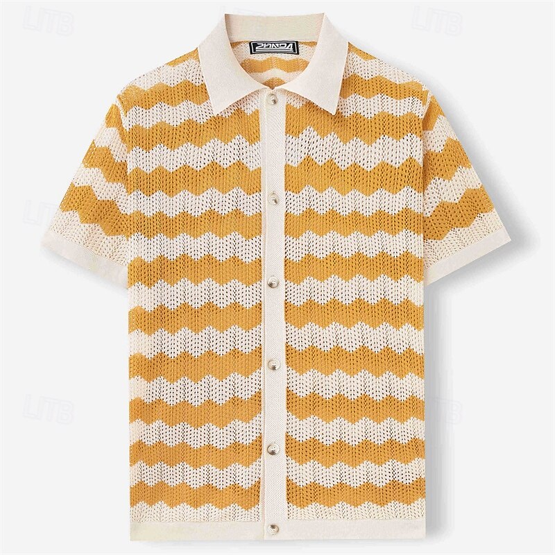 Men's Button Up Polos Golf Shirt Casual Sports Lapel Short Sleeve Fashion Basic Lines / Waves Buttons Summer Yellow Blue Brown Button Up Polos 11