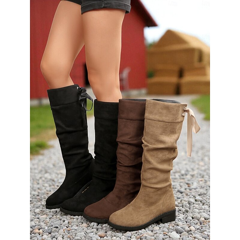 Why Choose Women's Brown Faux Suede Knee-High Boots with Ribbon Tie Back and Low Block Heel, Fashion Slouchy Style Fall Winter Riding Boots for Casual and Outdoor Wear?