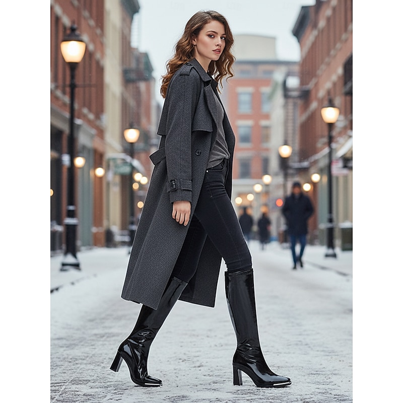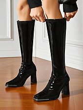 Women's Black Patent Faux Leather Knee-High Disco Boots – Square Toe Heel Boots for Parties, Costumes and Nightclub Outfits 17