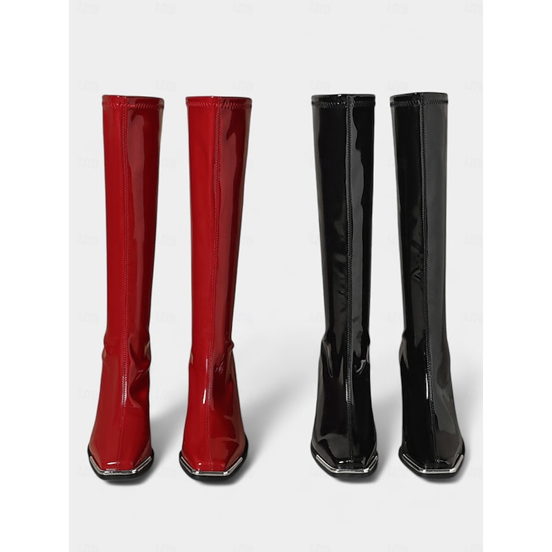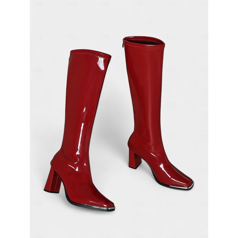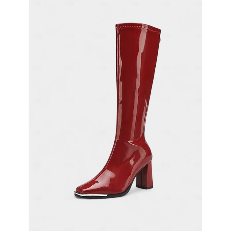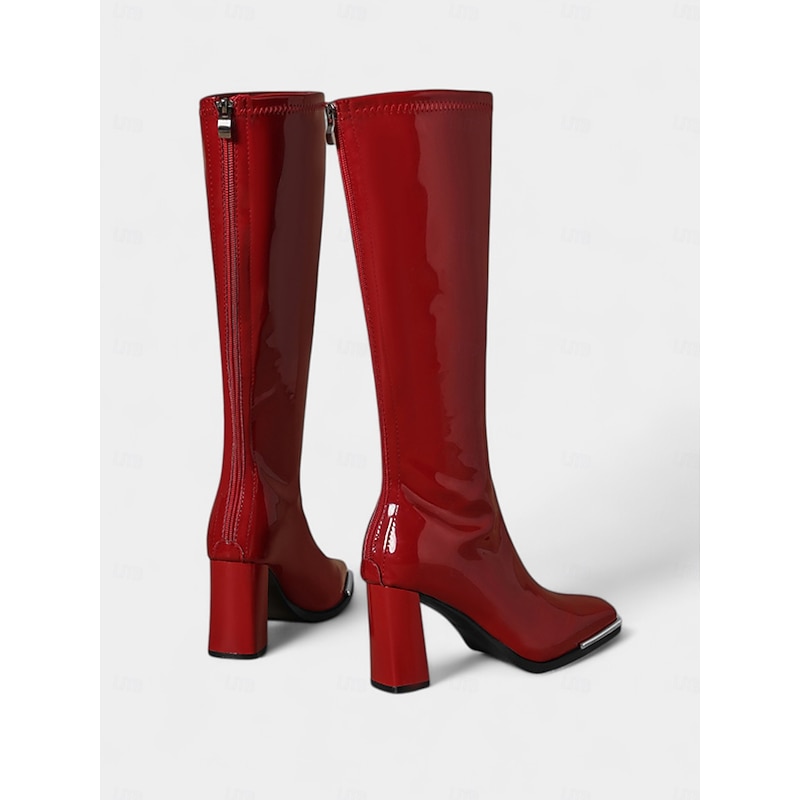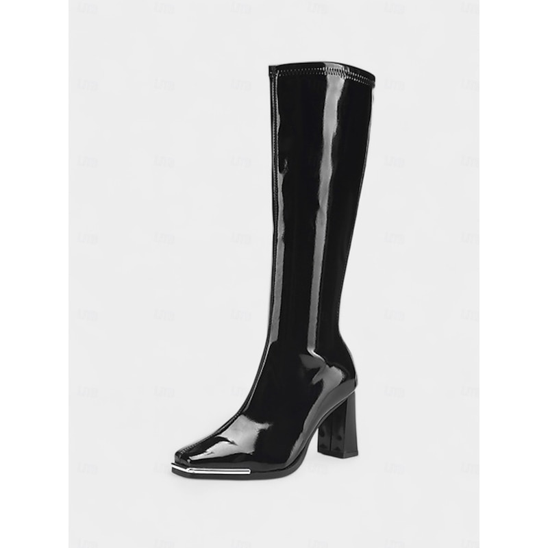 Women's Black Patent Faux Leather Knee-High Disco Boots – Square Toe Heel Boots for Parties, Costumes and Nightclub Outfits 8