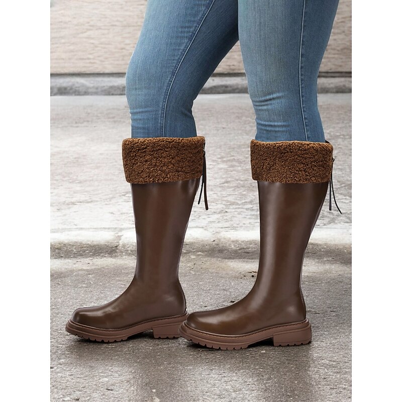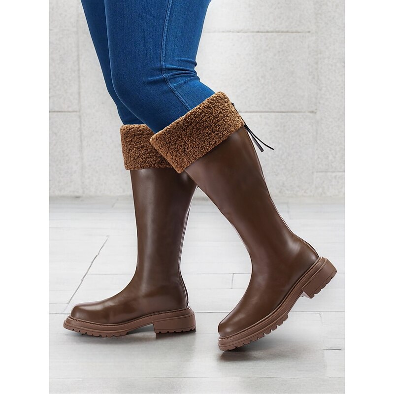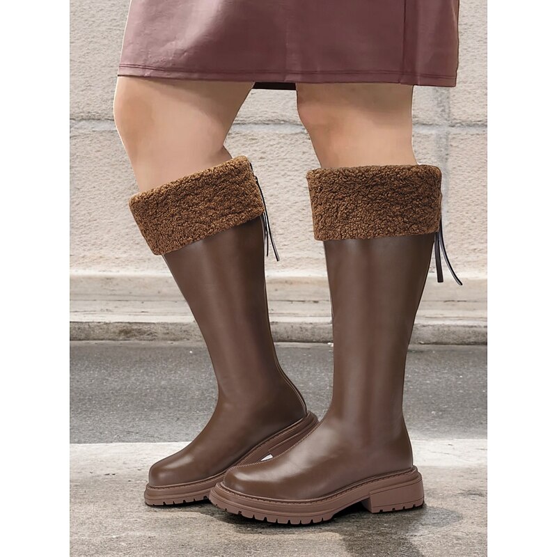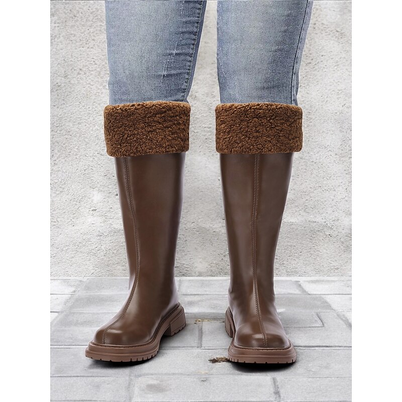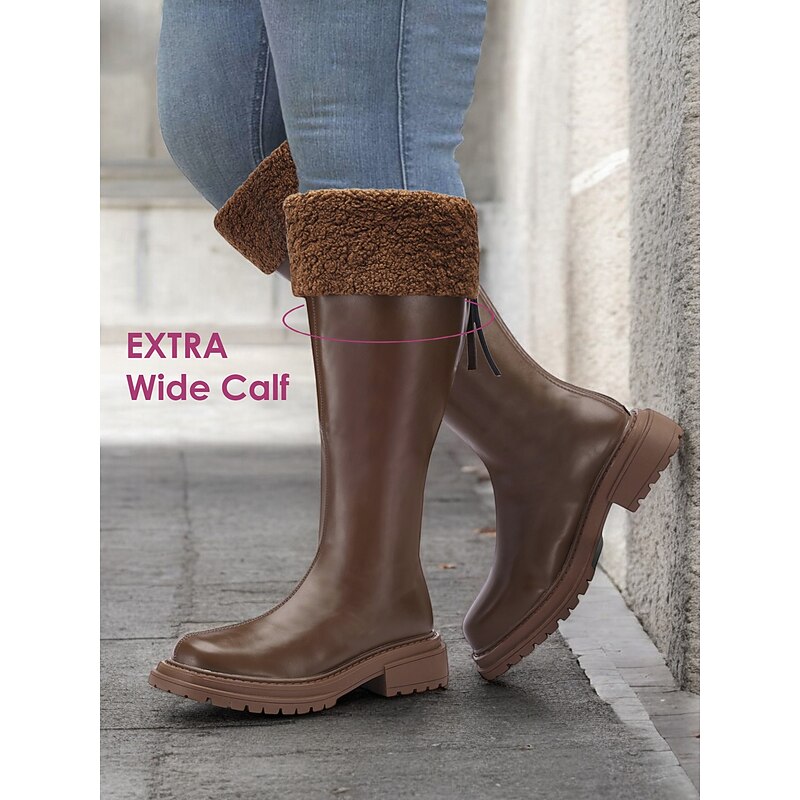 Women's Extra Wide Calf Brown Knee-High Boots with Faux Fur Cuff – Cozy Winter Footwear with Rugged Sole for Outdoor Comfort