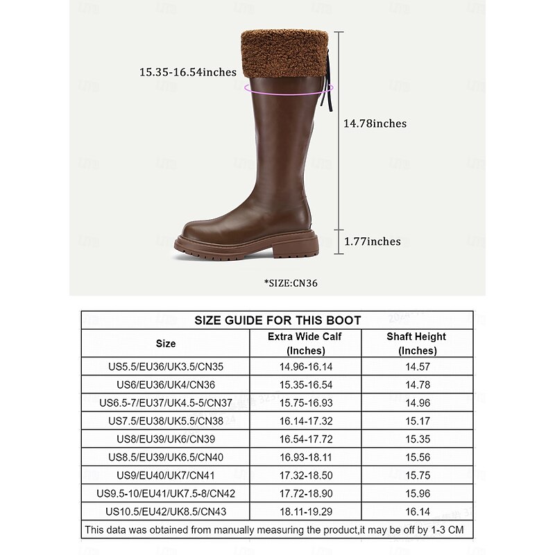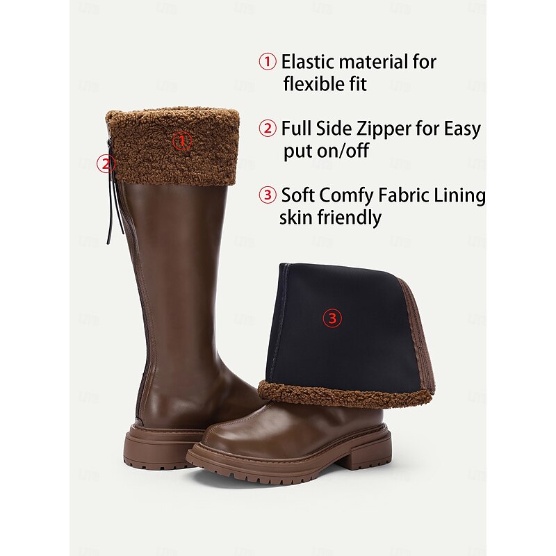 Highlights [Fabric] : Crafted with luxurious microbial leather, these women's knee-high boots feature a faux fur cuff that adds both warmth and an element of plush style. The durable leather exterior, paired with a textured rubber outsole, ensures a polished appearance that withstands various outdoor conditions. [Fit] : These boots showcase an extra-wide calf design, providing a comfortable fit for a variety of calf sizes without compromising on elegance. The low heel offers added support and ease for all-day wear, suited for urban settings or casual outings. [Design Highlights] : The boots incorporate a chic round toe design and feature a back zipper for easy on and off. The contrasting faux fur cuff not only adds a soft, cozy touch but also enhances the classic and minimalistic style of the boots, making them a fashionable choice for cold-weather fashion. [Occasions] : Perfect for daily wear during fall and winter, these boots are ideal for various activities, from weekend strolls to holiday gatherings. Their classic styling complements a wide range of outfits, offering both warmth and sophistication. [Size Notice] : Available in a range of sizes, including US5.5 to US10.5, these boots cater to different foot sizes, ensuring a suitable fit for all. The generous calf circumference of over 18 inches accommodates wider calves, making them a versatile addition to any winter wardrobe. Perfect for everyday use. top-grade materials and excellent craftsmanship ensure long-lasting durability.