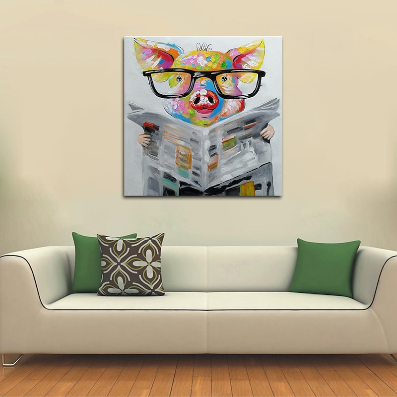 More information about Handmade Oil Painting Canvas Wall Art Decoration Pig Reading Newspaper Amimal Pattern for Home Decor Stretched Frame Hanging Painting