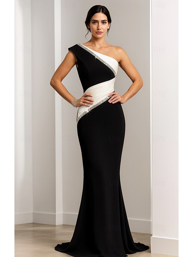 Black and White Mermaid Evening Gown Elegant Dress Wedding Formal Floor Length Sleeveless One Shoulder Stretch Crepe with Glitter Ruched 1