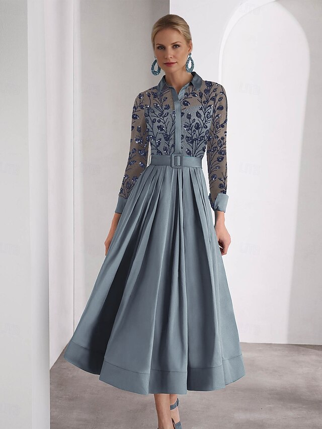 Why Choose Embroidered A-Line Mother of the Bride Cocktail Dresses Elegant Formal Wedding Guest Ankle Length Long Sleeve Shirt Collar Satin with Glitter Slit?
