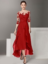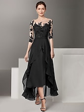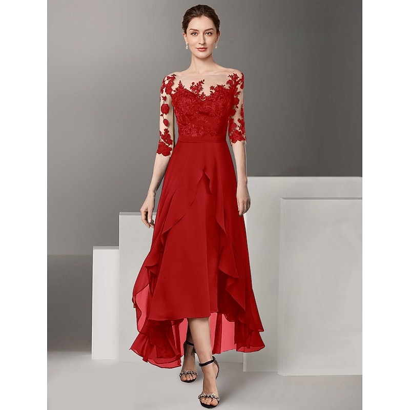 Highlights [Fabric] Crafted from high-quality chiffon and lace, this elegant evening dress exudes sophistication with its soft, flowing texture. The combination of these materials ensures comfort and a graceful drape, perfect for formal events. [Silhouette] Featuring an A-line silhouette with an ankle-length, high-low hemline, this dress is designed to flatter various body types while offering a latest twist to a enduring look. The empire waistline enhances an elegant silhouette, making it suitable for special occasions. [Design Highlights] The dress showcases an exquisite illusion neckline and off-shoulder design, adorned with intricate floral lace embroidery. The three-quarter illusion sleeves add a delicate touch, while the pleats and appliques provide a sophisticated texture contrast. The dress also includes a built-in bra and boning for added support and comfort. [Occasions] Ideal for formal events, weddings, and as a mother-of-the-bride dress, this piece combines timeless style with contemporary elegance. Whether attending a wedding or formal gathering, the dress ensures you stand out with grace and charm. [Size Range] Available in a wide range of sizes from US 0 to US 26W, and offering custom measurements for a personalized fit. This inclusive size range caters to various body shapes and preferences, ensuring the perfect fit for every occasion.