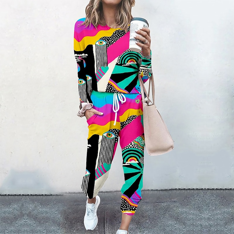 sizzling ! Women's Sweatshirt Tracksuit Pants Sets Streetwear Cinched Blue Yellow Going out Casual Daily Graphic Abstract Drawstring Print Crew Neck S M L XL XXL