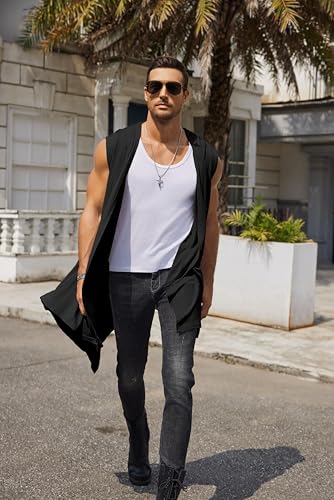 COOFANDY Men's Long Hooded Cardigan Sleeveless Ruffle Shawl Collar Lightweight Open Front Drape Kimono Vest 1