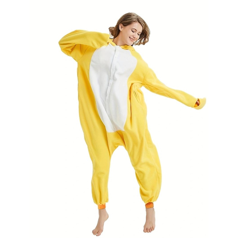Highlights [Fabric] : Crafted from soft, plush fleece, this onesie ensures optimum warmth and comfort for all-day wear. The micro-elastic nature of the material offers a snug yet flexible fit, making it perfect for lounging or casual outings. [Fit] : The loose-fit design provides generous space for movement, while the full-body coverage, including long sleeves and legs, enhances coziness. Available in a range of sizes from S to XL, this onesie caters to various body types and preferences. [Design Highlights] : This vibrant yellow onesie features a delightful duck character design, complete with a contrasting white belly. The hood is adorned with an adorable duck face, featuring embroidered eyes and a cute beak, adding an element of fun and playfulness to your attire. [Occasions] : Ideal for Carnival celebrations, lounging at home, or as a quirky and amusing costume for parties and events. This versatile piece adds a touch of humor and charm, making it suitable for various festive and leisure settings. [Size Range] : Available in sizes S, M, L, and XL, this onesie accommodates a wide range of adult wearers, providing a pleasant and trendy option for both men and women.