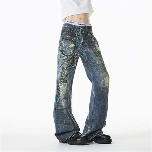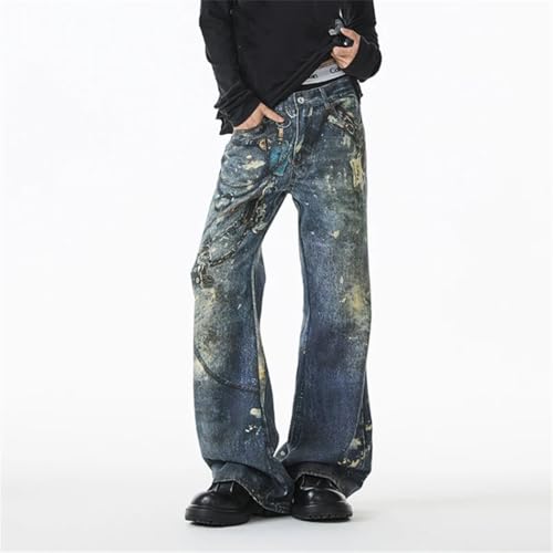 Men's Summer Bootcut Jeans, Chain Print Splash-Ink, Fashion Baggy Vintage Denim Pants 6