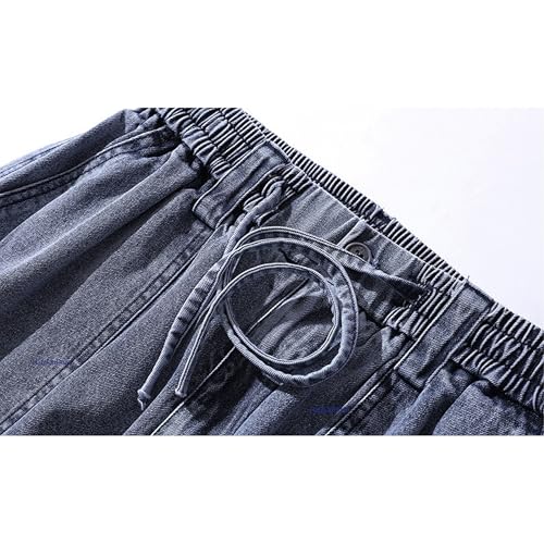 Men's High Street Multi Pocket Cargo Denim Casual Pants Drawstring Pants with Streamers Mens Baggy Blue Trousers