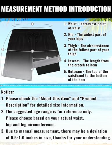 • ADJUSTABLE DESIGN & SIZE INFORMATION: Our swimming shorts for men are available in 4 sizes from M to XXL. The elastic waistband of our men's swimwear is practical to put on and take off. Meanwhile, the beach shorts for men are designed with an adjustable drawstring, which not only enables flexible waist adjustments for an optimal fit but also prevents slipping down during vigorous sports! Please refer to the size chart and measure your actual waist, leg, and hip circumference before choosing.