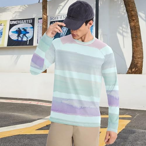 sizzling ! Watercolor Stripes Men's Rash Guard Loose Crew Neck Comfort UV Protective Clothing Beach