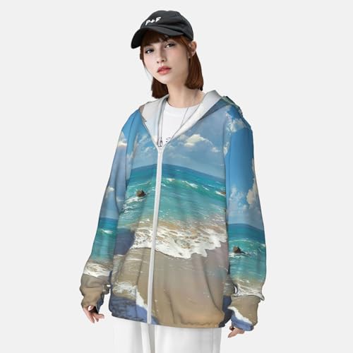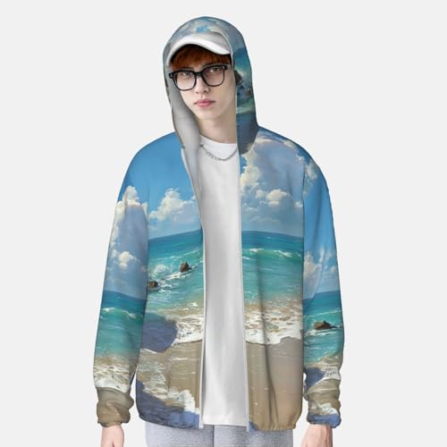 Fabric type: 100% PolyesterClosure type: ZipperNeck style: Hooded NeckSleeve type: Long SleeveBreathable and Quick-Dryinge: Sun protection hoodie is made of polyester encrypted jacquard fabricand waterproof dry material ,ight, breathable, soft touch, windproof, sunscreen, to keep you comfortable and dry.Whether you're at the beach, pool, or exercising outdoors, it protects your skin so you can enjoy the great outdoors with peace of mind.Full Zipper Closure: Beach Picture Sun Shirt Outdoor lightweight full zip hoodie jacket, with long sleeve and a hood to protect you from ultraviolet rays and long-term skin damage.that complements both casual and athletic wear.Occasions: Our Beach Picture light jackets for women and men can be the perfect addition to your wardrobe. It's adaptable to any kind of lower outfit and is suitable for a broad range of outdoor activities, including beach outings, running, cycling, fishing, hiking, camping, and even leisurely strollsJackets Dimensions: 6 sizes available, ranging from s-3xl, unisex. Please choose the right size according to the size chart before ordering. Comfortable and fitted sun protection jacket can be paired with a variety of undergarments such as pants, skirts and sneakers.Versatile Style: This Men's sun protection shirt has a simple and elegant design, which is not only suitable for matching with swimsuits and sportswear, but also can match up with a variety of pants and shoes. Now you can choose a one-of-a-kind sun protection clothing for your family, friends or yourself to protect the skin and show your fashion sense at the same time. Perfect for everyday use. top-grade materials and excellent craftsmanship ensure long-lasting durability.